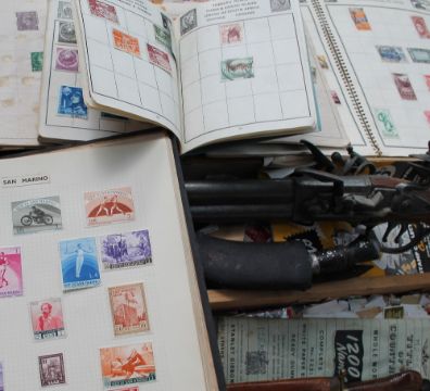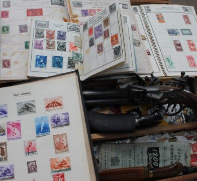 A stamp album containing world stamps together with other stamp albums, loose stamps, replica pistol, two knives and a fire and waterproof sentry safe
