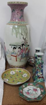 A Famille Jaune dish, Chinese vase, pair of bowls and plate
