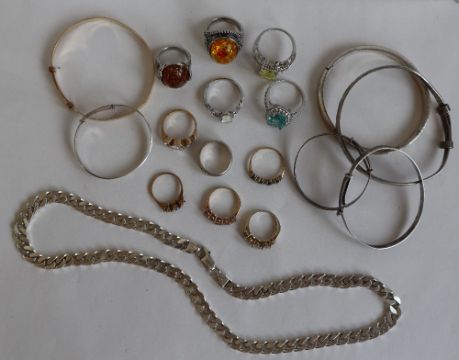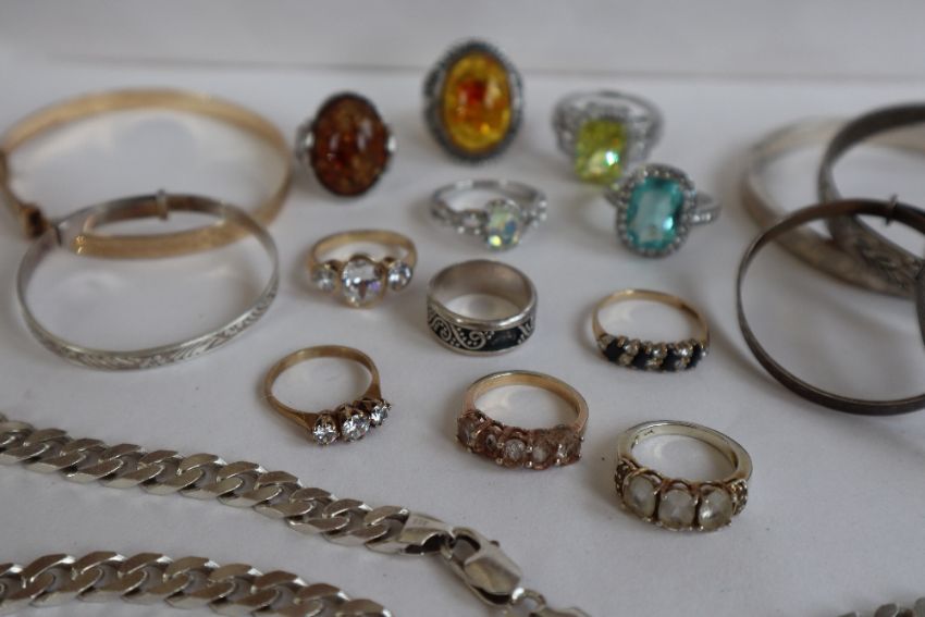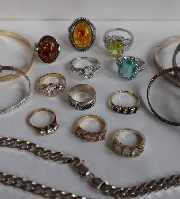 Three 9ct yellow gold dress rings set with semi precious stones together with a collection of dress rings, a silver necklace, bangles etc