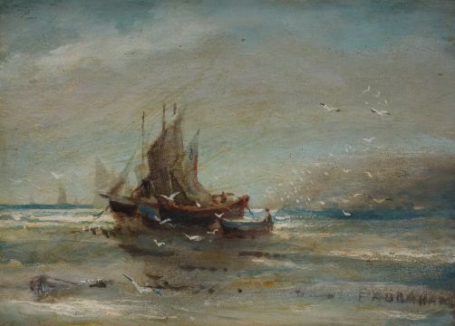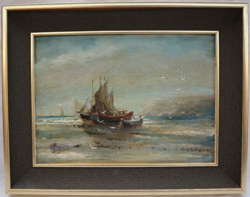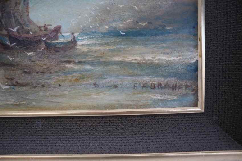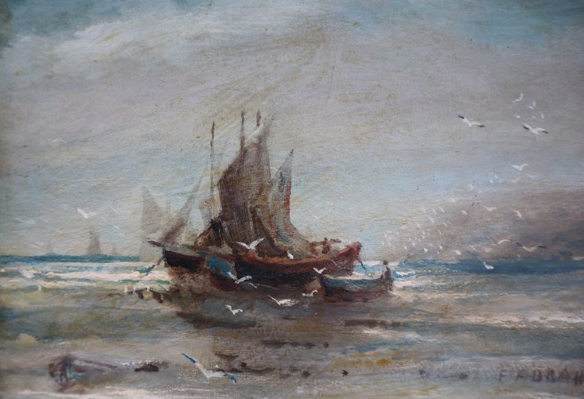 F AbrahamShips moored off the coastOil on boardSigned21 x 29.5cm