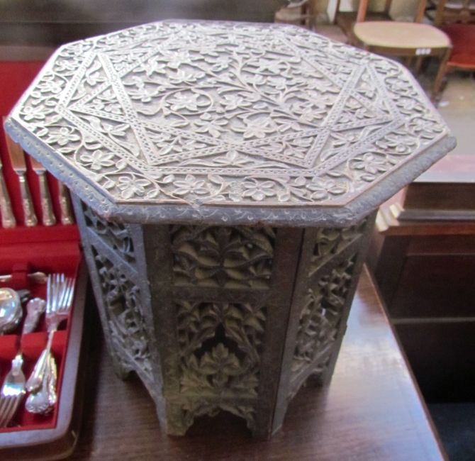 An Anglo Indian hardwood occasional table with an octagonal top and base carved with flowers and leaves, 38.5cm wide