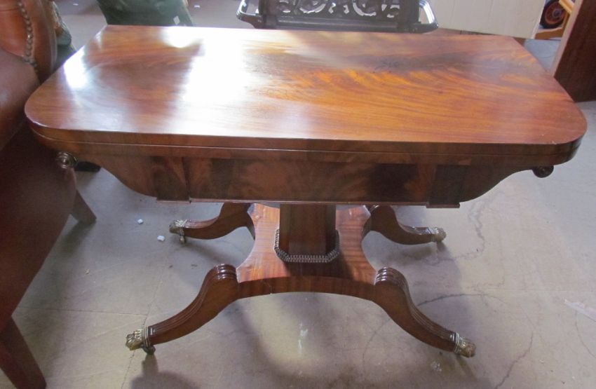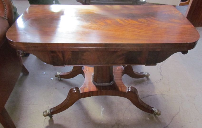 A Regency mahogany card table with a rectangular fold over top with a baize interior on a tapering column and four reeded legs with brass cappings and casters