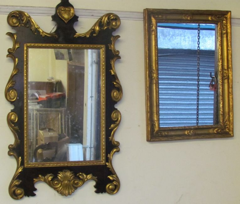 A mahogany and gilt decorated wall mirror with a heart shaped cresting and another gilt wall mirror