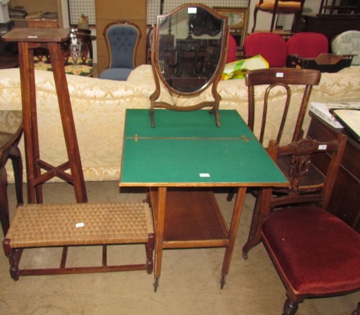 A 20th century card table tea trolley together with a 19th century shield shaped toilet mirror, bentwood chair, nursing chair, torchere and a stool