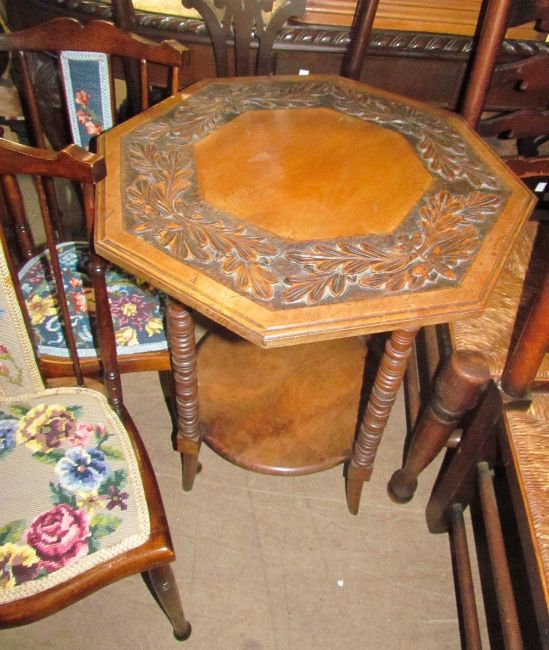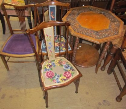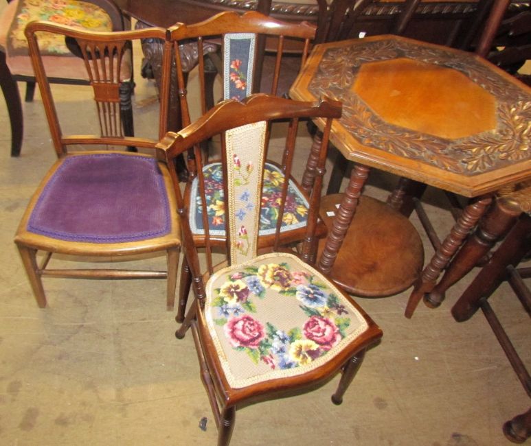 A carved occasional table together with a pair of bedroom chairs and a salon chair