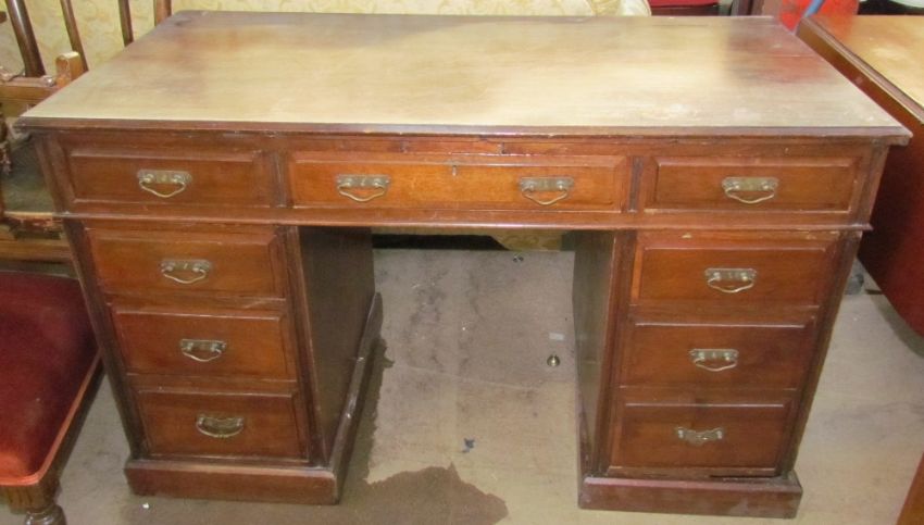 An Edwardian mahogany desk with a rectangular moulded top above a central drawer and two banks of four drawers on plinths