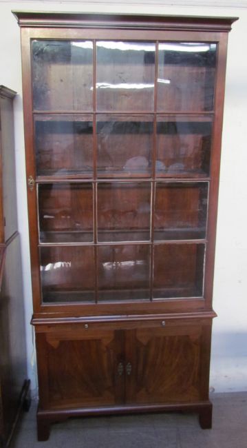 A Regency style mahogany bookcase with a moulded cornice and single glazed door with glazing bars, the base with a brushing slide and two cupboard doors on bracket feet, 110cm wide x 231cm high
