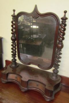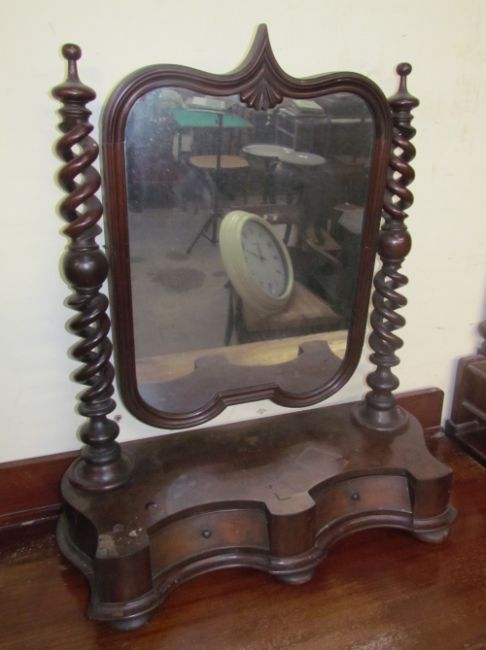 A Victorian mahogany toilet mirror, the pointed arched mirror between barley twist supports above a shaped front and two drawers on flattened bun feet