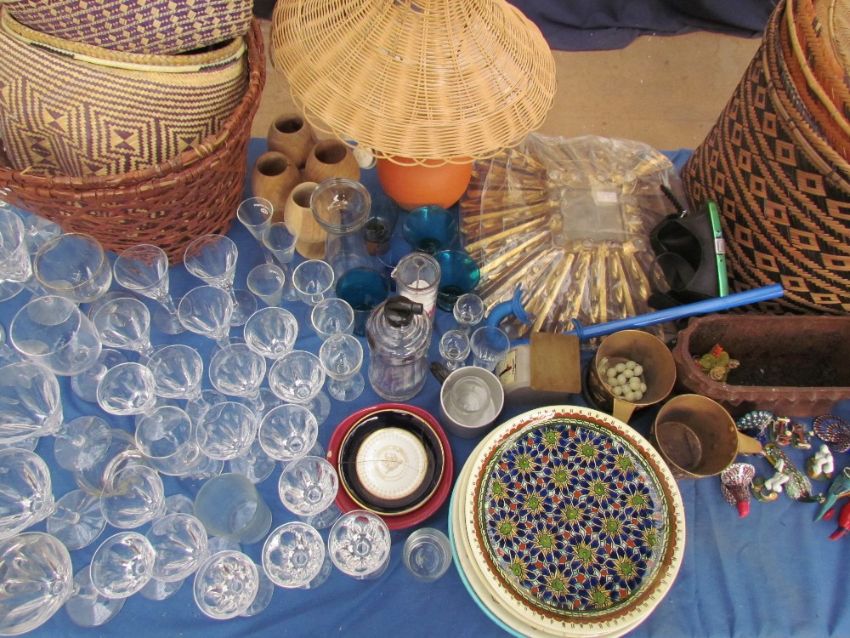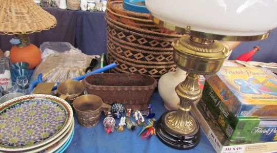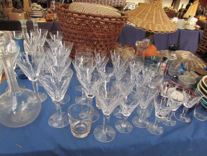 An extensive lot including a brass converted oil lamp, baskets, drinking glasses, pictures, plates, table lamps, etc