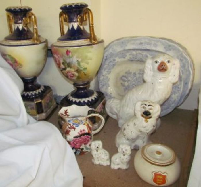 A pair of pottery vases together with blue and white pottery meat plates, Staffordshire type dogs, Martin's Varsity Bitter Marmalade pot etc