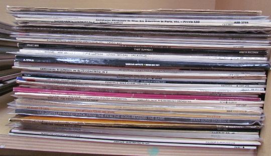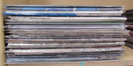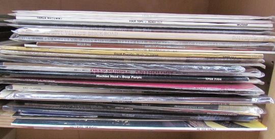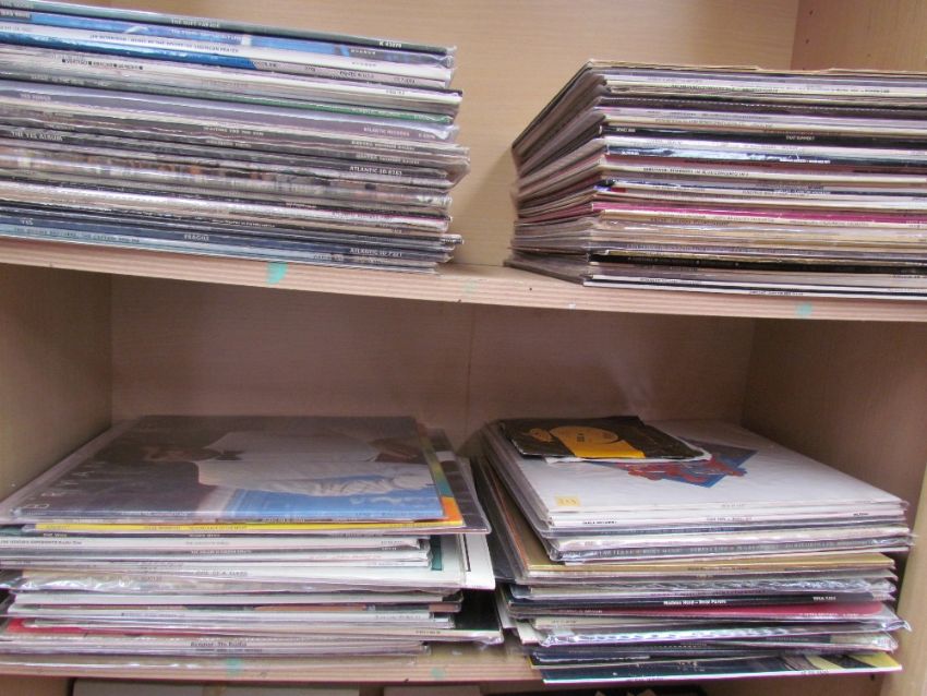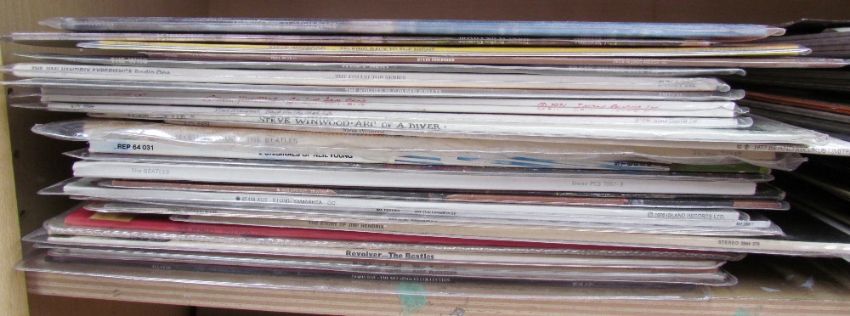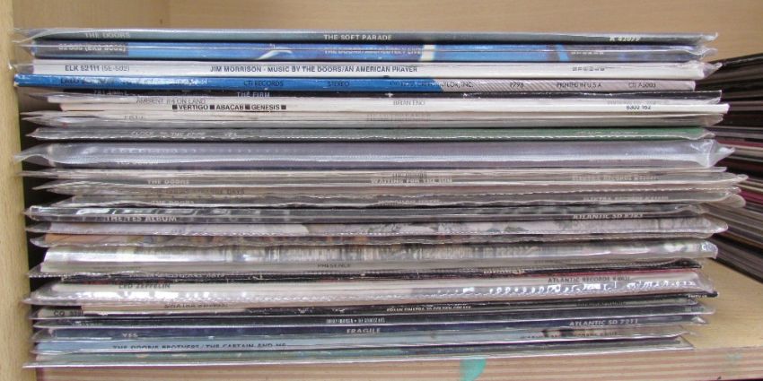 A collection of records including Led Zeppelin III, Jimmy Page & Robert Plant unplugged, Led Zeppelin In Through the Out Door, Joni Mitchell, Nat King Cole, Ian Drury, The Doors, Yes, Genesis, Frank Zappa, the Beatles, Eric Clapton, Deep Purple, etc