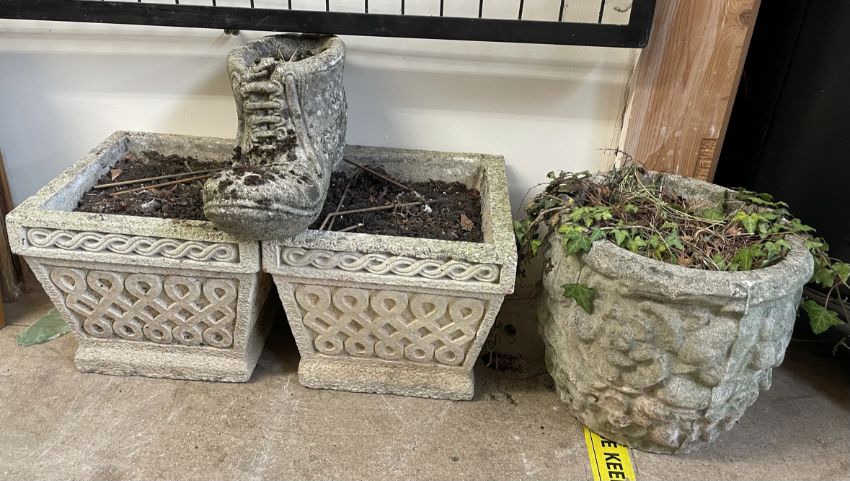 A pair of reconstituted stone planters of square tapering form together with a planter in the shape of a boot and another planter