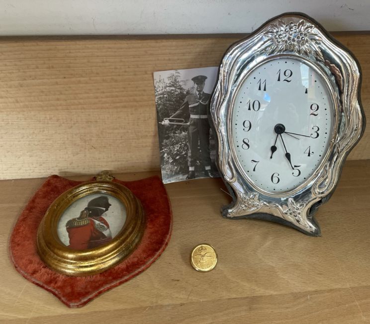 A silver framed desk clock, together with a print of a miniature and a R.C.A.F. button
