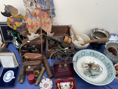 A pestle and mortars together with binoculars, Wedgwood plaque etc