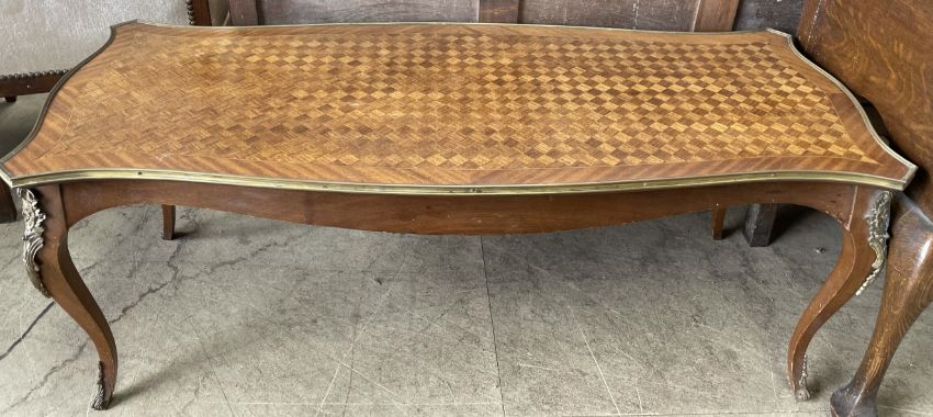 A French Kingwood coffee table with a shaped parquetry top on cabriole legs with gilt metal mounts and sabot feet