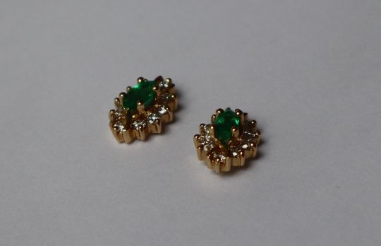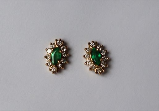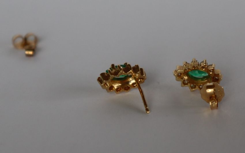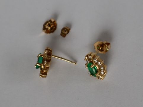 A pair of emerald and diamond earrings, set with a pointed oval emerald surrounded by ten round brilliant cut diamonds to a yellow metal setting and post, approximately 2 grams