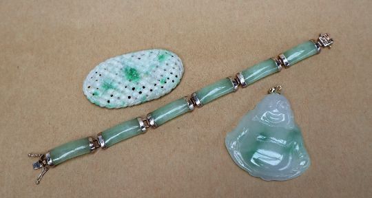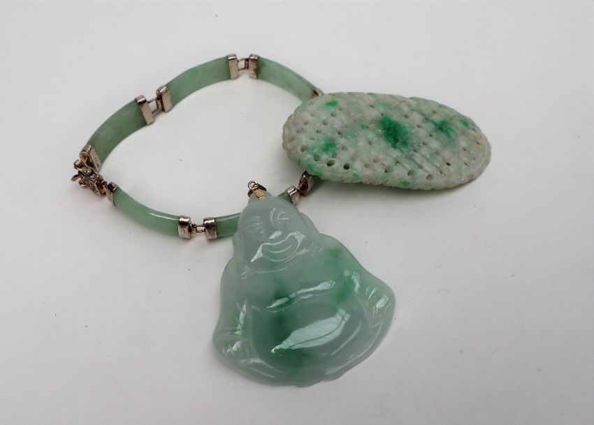 A green jade and white metal sectional bracelet together with a jadeite buddha pendant and a jadeite pierced and carved panel