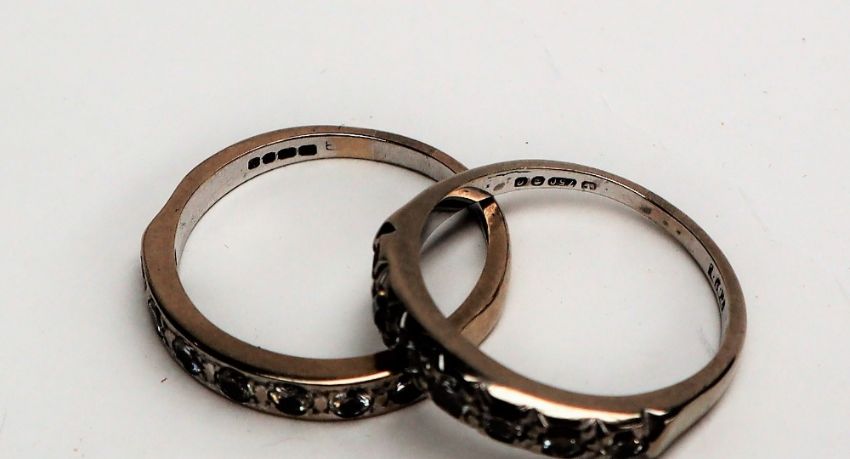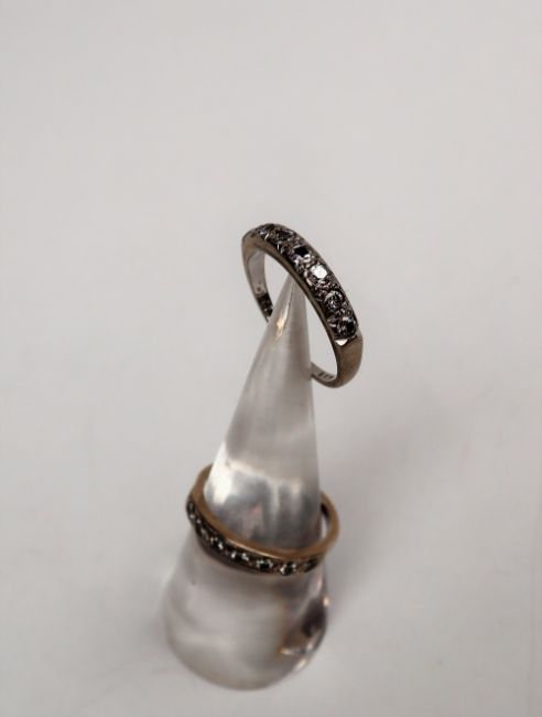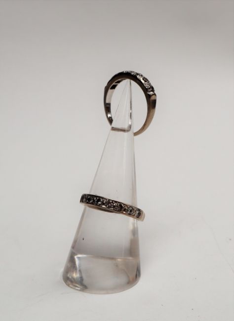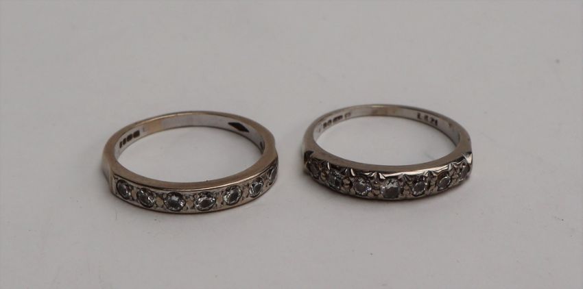 An 18ct gold seven stone diamond line ring, together with another similar, approximately 7 grams