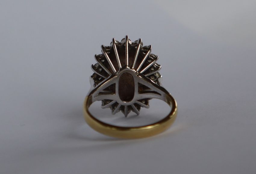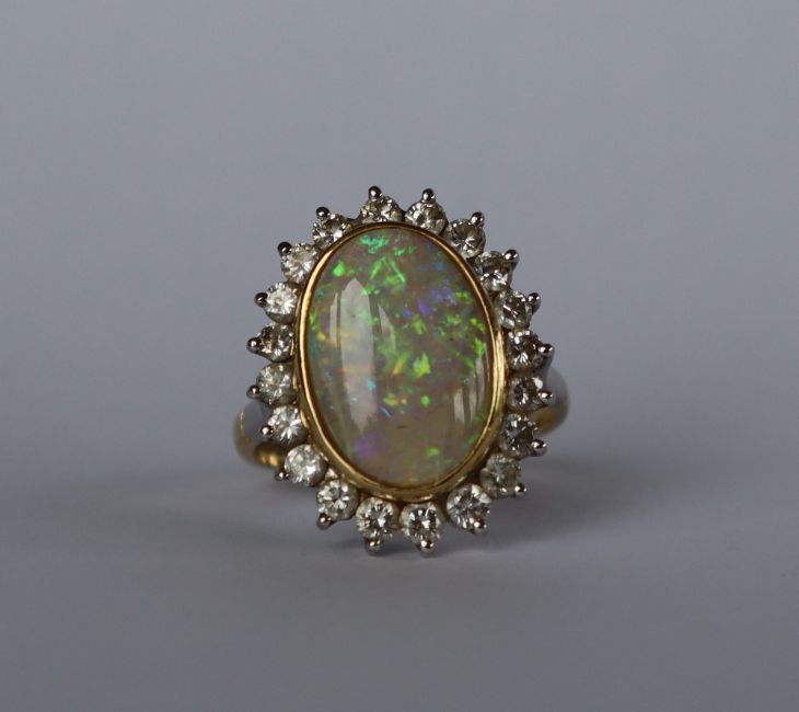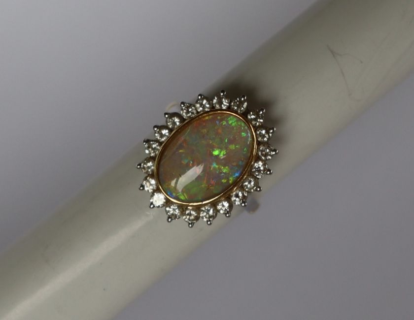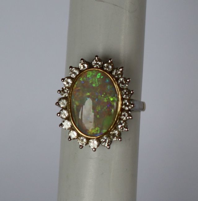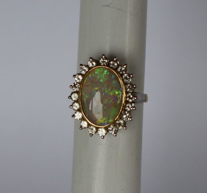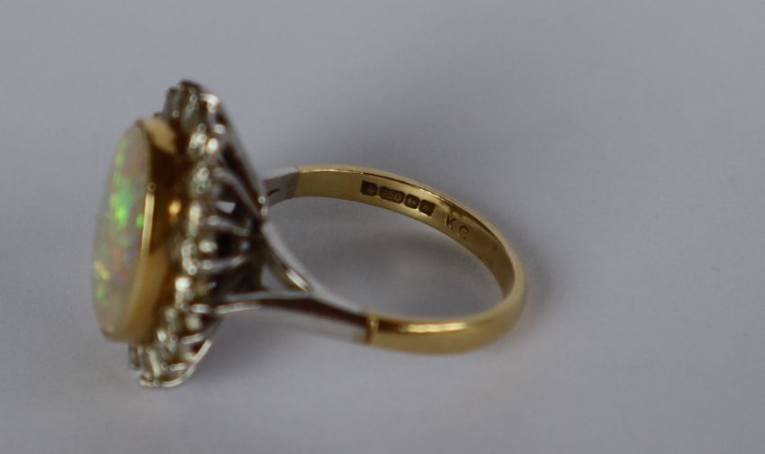 The opal has a small hairline crack, surface scratches, in worn condition, surface scratches to the shank and setting of the ring