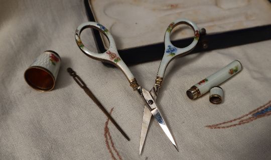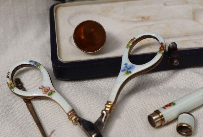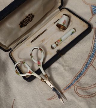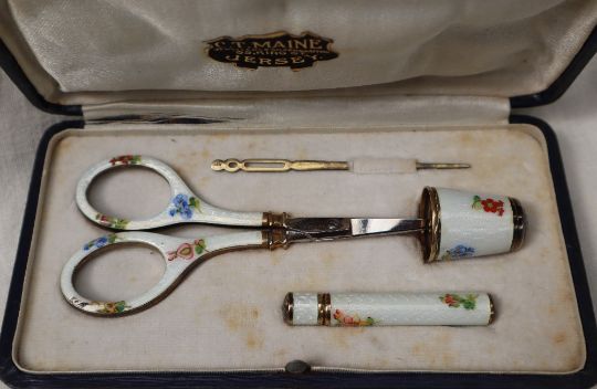A continental white metal and enamel decorated sewing set, comprising scissors, thimble, needle case and threader, cased, with a trade label for C.T. Maine, 25 King Street, Jersey