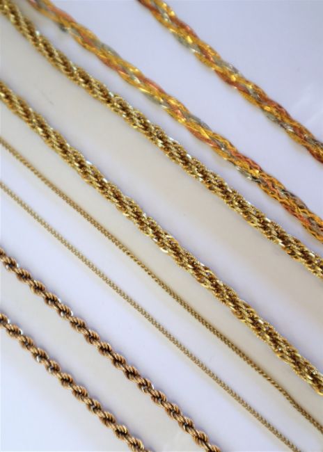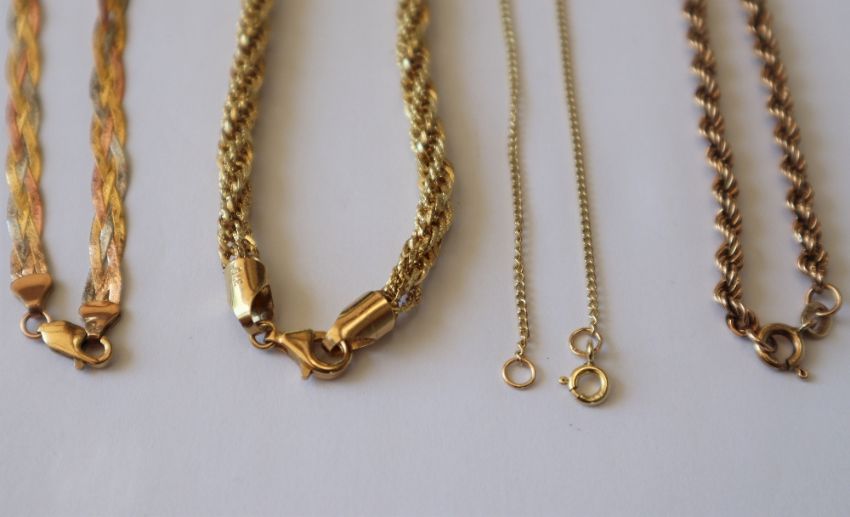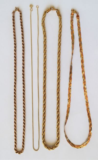 A 9ct yellow gold rope twist necklace together with three other 9ct gold necklaces, approximately 18.5 grams