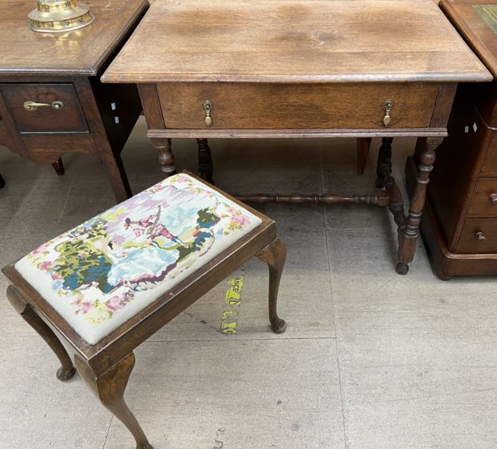 An oak side table with a rectangular planked top above a single drawers on ring turned legs together with a dressing table stool