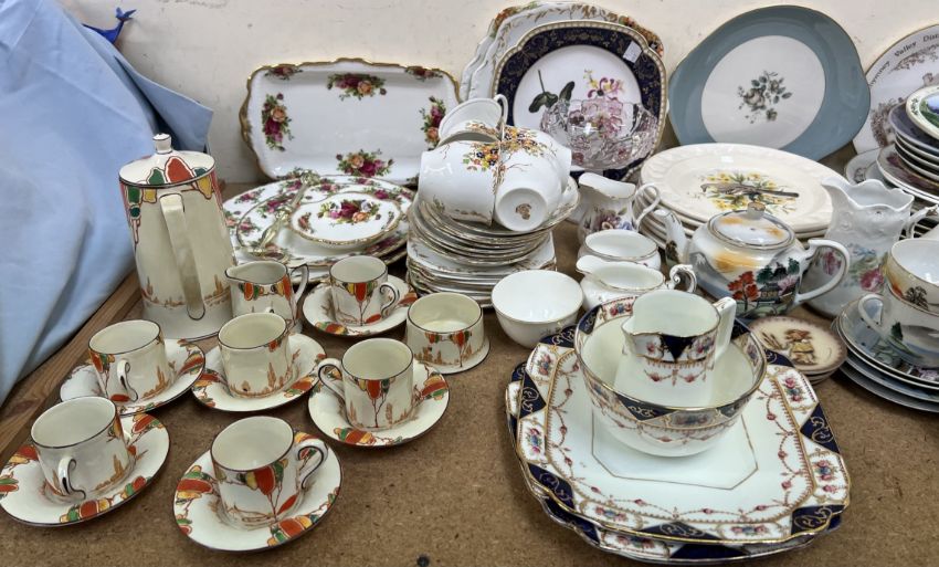 A large lot including an T G Green & Co Over the hill pattern coffee set, together with Royal Albert Old Country roses pattern cake stand, other part tea sets, jugs, collectors plates, bowls, gilt spoons, etc