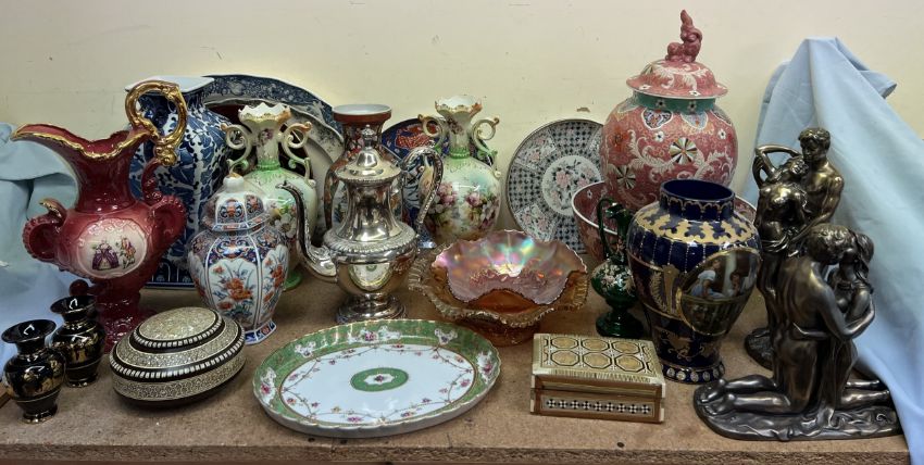 A blue and white meat plate together with modern Chinese vases, plates etc