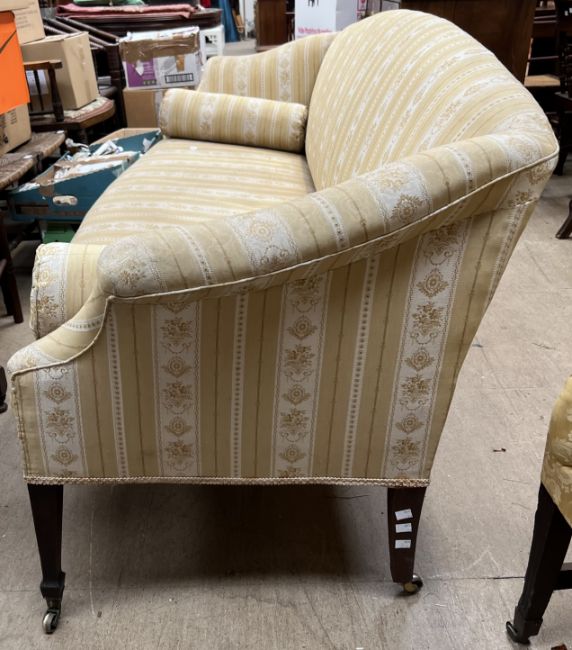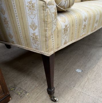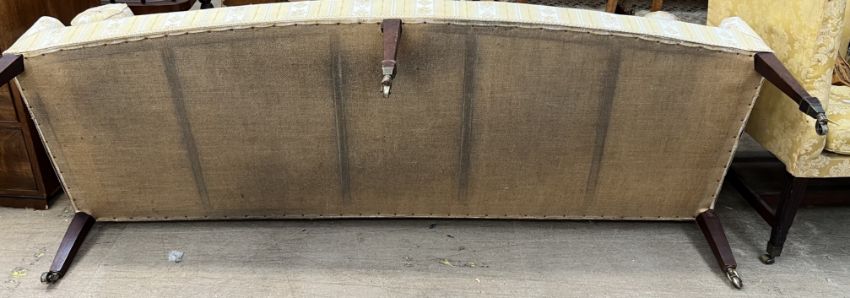 A 19th century mahogany settee with out swept arms on square tapering legs, spade feet and casters, 218cm wide