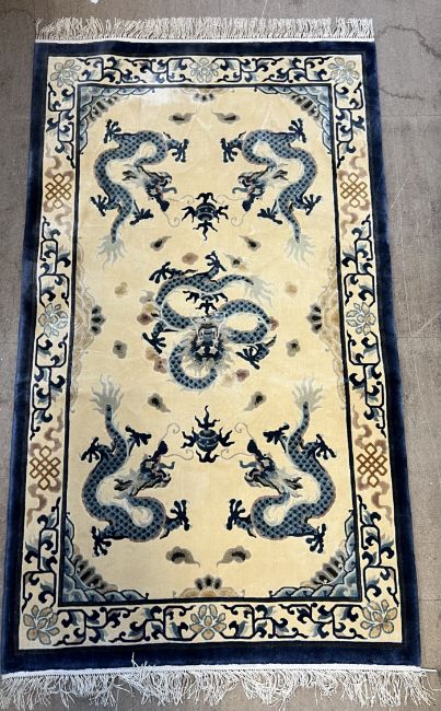 A Chinese rug with a cream ground decorated with dragons, 156 x 92cm