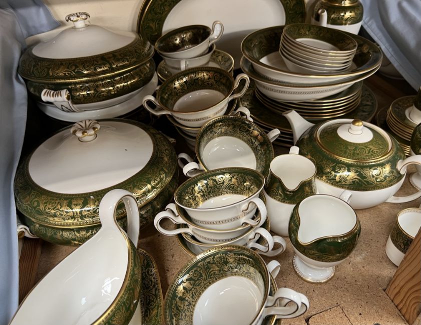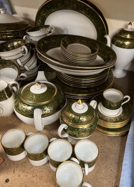 A Wedgwood bone china Florentine W4170 pattern part tea and dinner service in green and gold