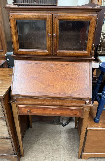 A 20th century mahogany bureau display cabinet with a glazed top and sloping fall on square tapering legs