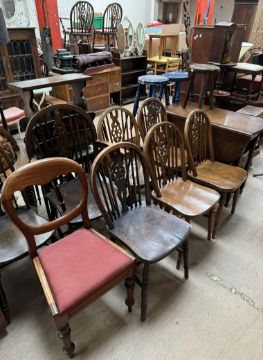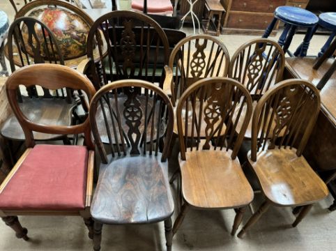 A matched set of six wheelback dining chairs together with two other chairs, a carved back stool and a gateleg dining table