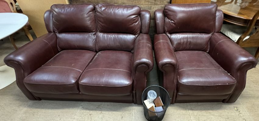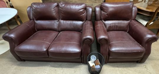 A brown leather two seater settee together with a matching armchair