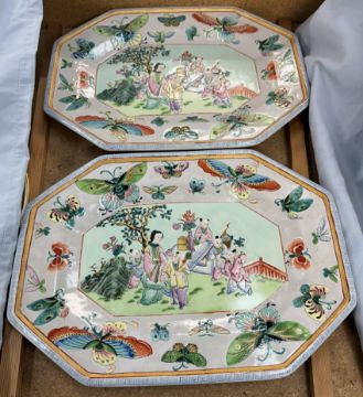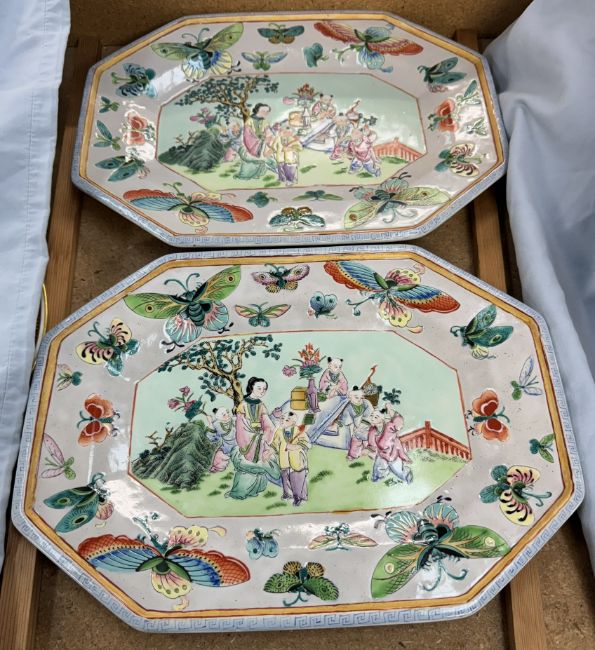 A pair of Chinese porcelain octagonal plates decorated with a figure and children to a butterfly border