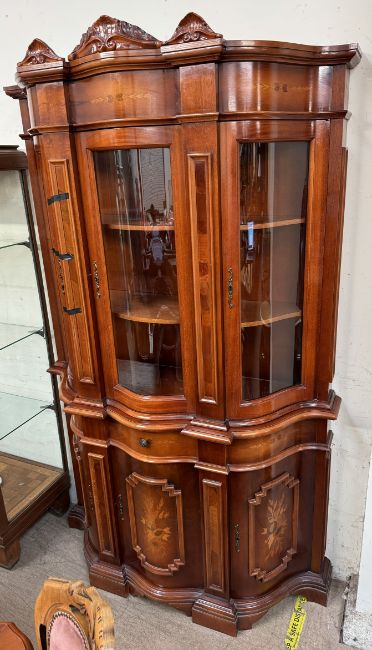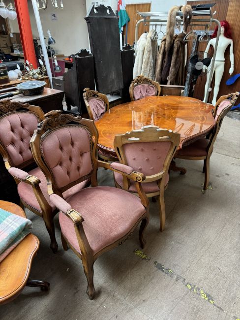 An Italian reproduction marquetry decorated dining suite comprising a dining table, six chairs and a wall unit