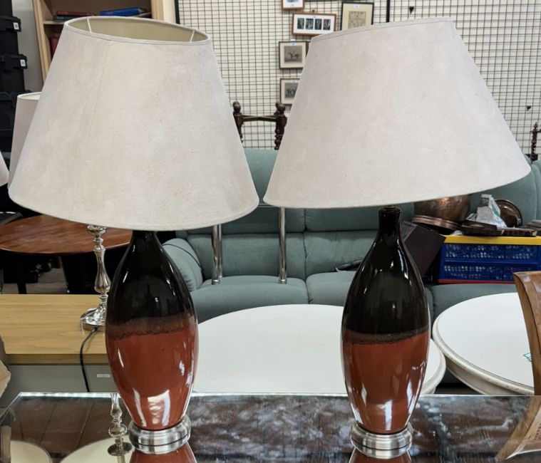 A pair of pottery two tone table lamps