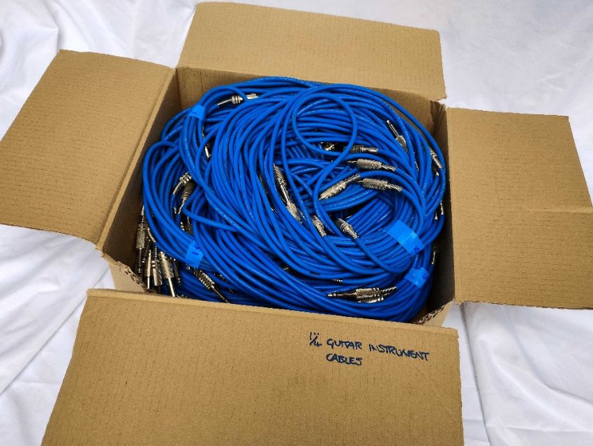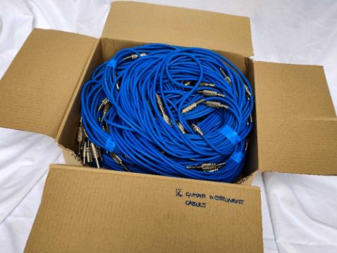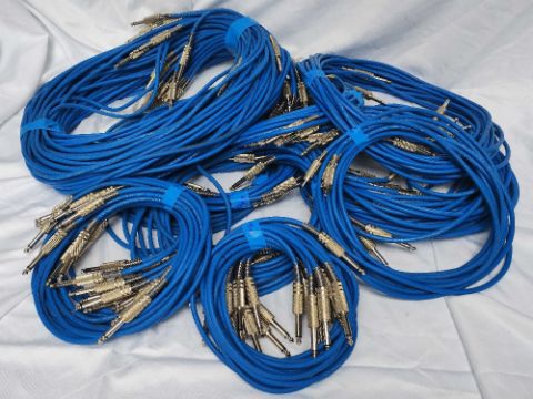 A blue Van Damme Guitar/ Instrument Cable - A large selection of 1/4" mono jack terminated quality cable. Over 80 cables with lengths from around 1m to over 5m. Untested.