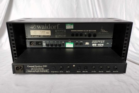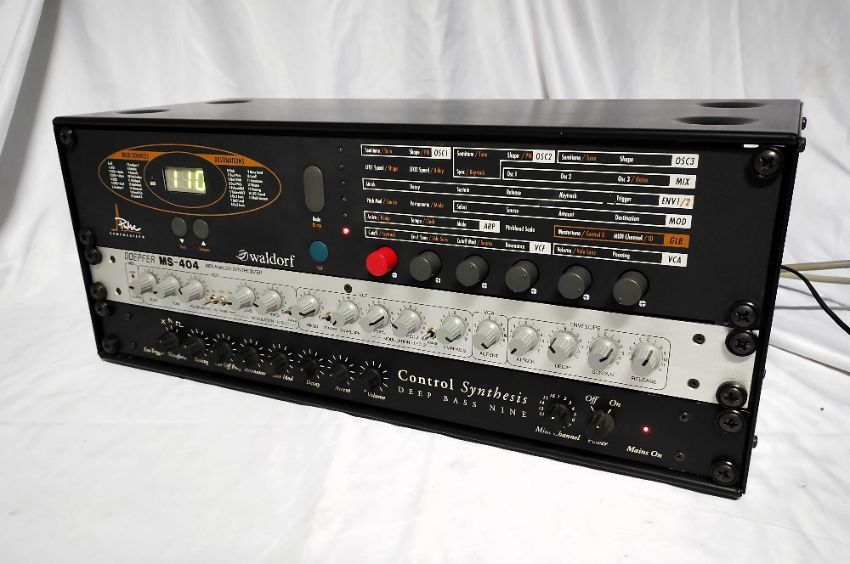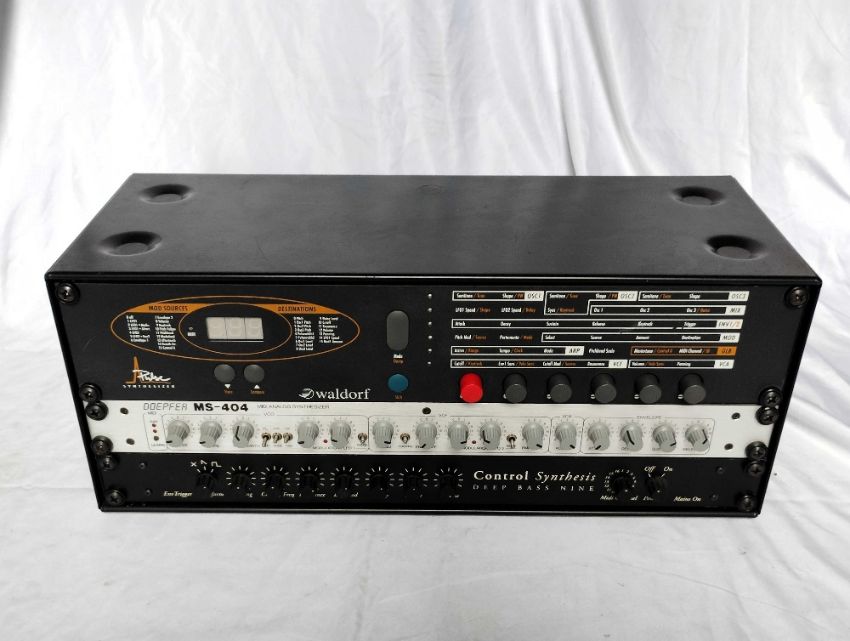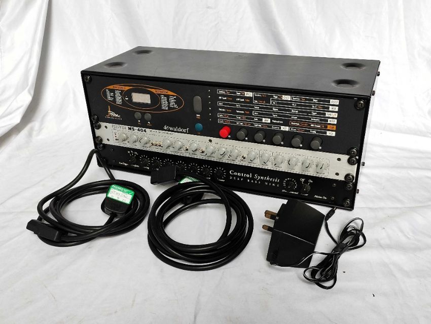 Waldor Pulse, Doepfer MS 404 and Control Systems Deep Bass Nine CONDITION REPORT: All 3 analogue mono synths come mounted in a stackable rack unit. All 3 come with power supplies and the Waldorf Puls comes with an operator's manual. All three tested and appear to be working. No guarantee or warranty implied. Operational status may change during shipping.