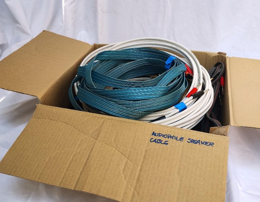 A collection of Various Audiophile Speaker Cables including: Audioquest (2 pairs of 2m socket plugs, pair of Rocket 33 bi-wire 2m and a pair of Easyslip bi-wire 2m) Kimber Kable (pair of blue and black 8 wire 2m, pair of brown and black 8 wire 2.8m and a pair of brown and black 4 wire with socket ends 2.6m. QED (pair of Silver Anniversary 2m and a pair of profile bi-wire with sockets on one end 4m) A pair of NAIM Audio white 3.5m, a pair of Cyrus 2m with socket ends and a pair of Sharkwire 2m with sockets one end and unterminated the other.