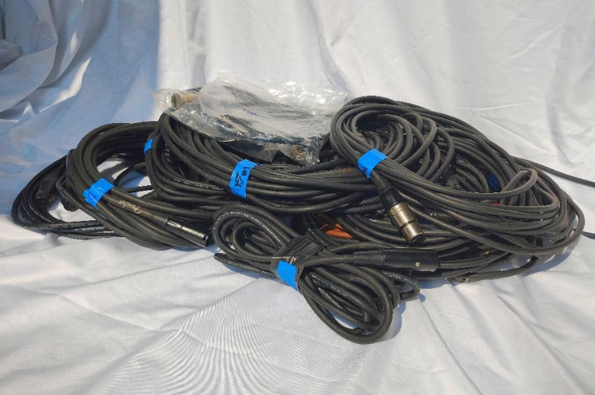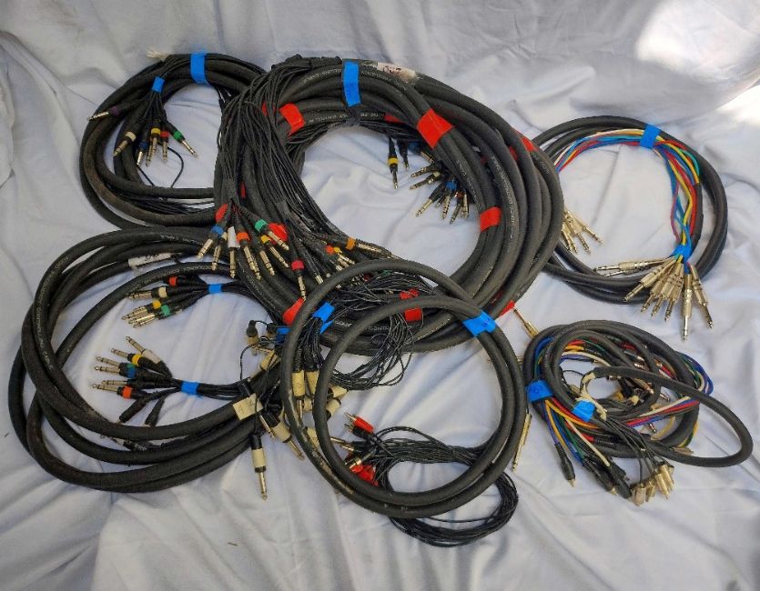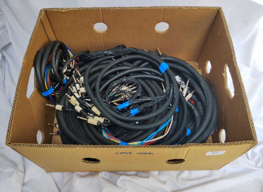 A box of XLR Cables together with a Box of TRS Cable Looms - 19 XLR cables of various lengths from 1 to 15 metres. Various brands from Van Damme, Venom, Fender, Stagg, Mogami and Neutrik9 audio cable looms: 4 x 5 8 way "Audio Frequency Controlling Cable" colour coded balanced TRS5m 8 way colour coded balanced TRS6m 8 way colour coded balanced TRS3m 8 way colour coded balanced TRS2.5m 16 way mono TS jack to RCA1.7m 8 way mono TS jack to RCA1.3n 8 way mono TS jack to RCA CONDITION REPORT: All cables untested